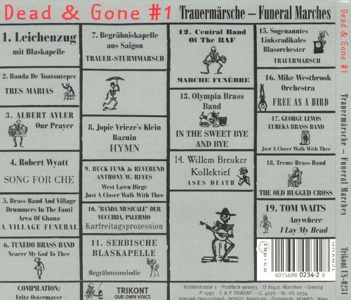 Avec aussi Leichenzug, Banda de Tontonpec, Albert Ayler, Robert Wyatt, Brass band and village drummers in the Fanti area of Ghana, Tuxedo brass band, Bregräbniskapelle aus Saïgon, Jopie Vrieze’s Klein Bazuin, Banda Musicale der Vucciria, Palermo, Serbische Blaskapelle, Central band of the RAF, Olympia Brass Band, Willem Breuker Kollektief, Songenanntes Linksradikales blasorchester, Mike Westbrook, George Lewis Eureka Brassband, Treme Brassband, Tom Waits. Nato